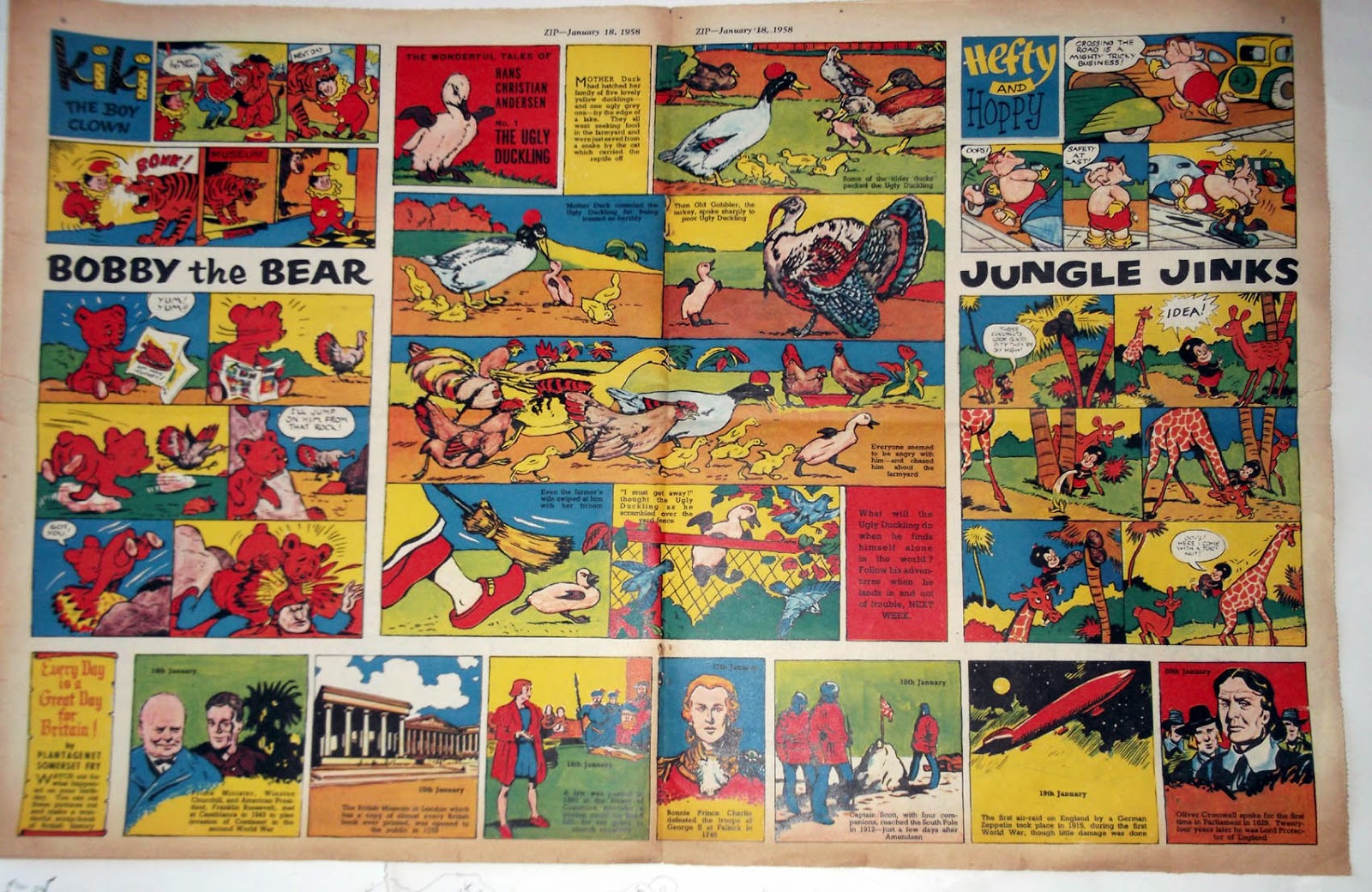 Zip is a comic that seems quite rare. I'd heard of it but had never seen a copy until this issue turned up on eBay last week for a reasonable price. It was a tabloid sized weekly published by Odhams and ran for 92 issues from 1958 to 1959 before merging into Swift. Apparently Zip was a replacement for Mickey Mouse Weekly after Odhams lost the rights to the Disney strips. (Source: http://ukcomics.wikia.com/wiki/Zip )