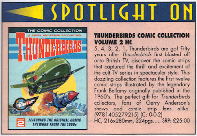 I noticed this ad in the latest Previews catalogue. It looks like Egmont are releasing a second volume of sixties Thunderbirds comic strips reprinted from TV21. (The first volume was published in 2013 and I reviewed it here.) The promo says it will feature "the first twelve comic strips" by Frank Bellamy. Those early three page strips originally appeared as a double page spread and a black and white page, so it'll be interesting to see how they paginate those. The spread will obviously have to be reprinted as a spread but what will appear on every fourth page opposite the black and white page? A classic TV21 cover perhaps? Time will tell, as the book is due in October.